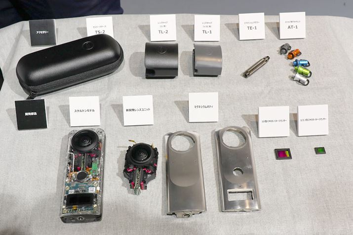 THETA Z1の部品。手前左から、スケルトンモデル、新開発レンズユニット、マグネシウムボディ、1.0型CMOSセンサー、比較用の1/2.3型CMOSセンサー(THETA V/SCのセンサーサイズ)