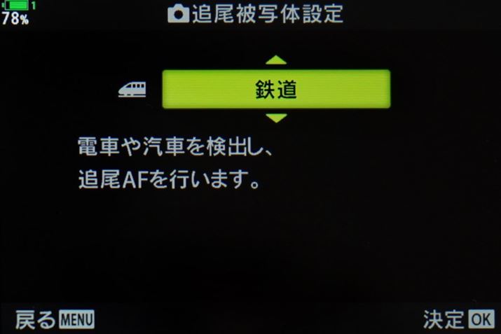 インテリジェント被写体認識AFは「C-AF+TR」時に有効な機能。追尾する被写体としてモータースポーツ、航空機、鉄道を選べる。このメニューで被写体を設定しておかないと機能がオンにならいので注意