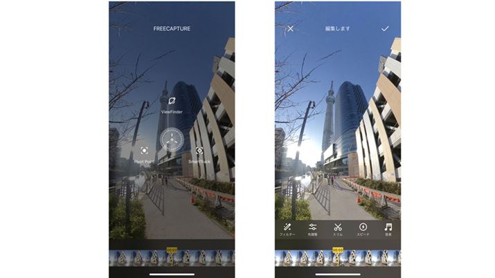 iOS版の「Insta360 EVO」アプリで編集をしている様子。「iPhone XS」で使用したところ動作は軽快で、旅先で撮った映像をサクッとSNSにシェアするのに便利そうです