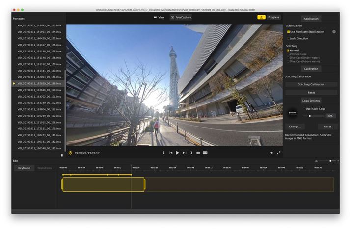 Mac版の「Insta360 EVO」で動画を編集している様子。MacBook Pro(2016年モデル、15インチ、CPU「Core i7 2.6Ghz」、メモリー16GB、GPU「Radeon Pro 460」)では少しプレイバックなどにモタつきが感じられましたが、フリーズなどの問題はなくちゃんと作業ができるレベルでした