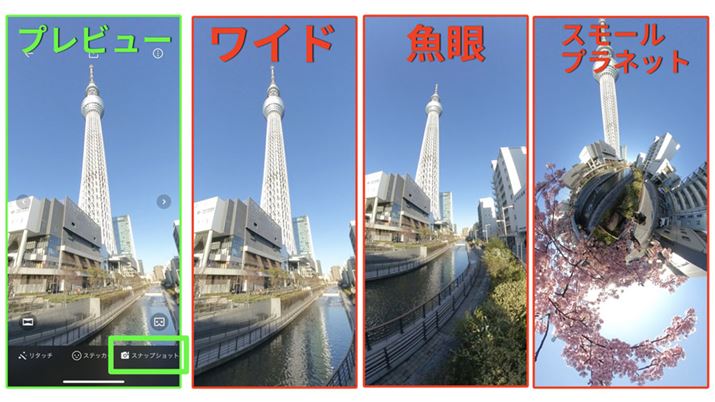 360°、および、180°の静止画は、撮影後に好きなアングルや効果を選んで「スナップショット」としてカメラロールに保存できます