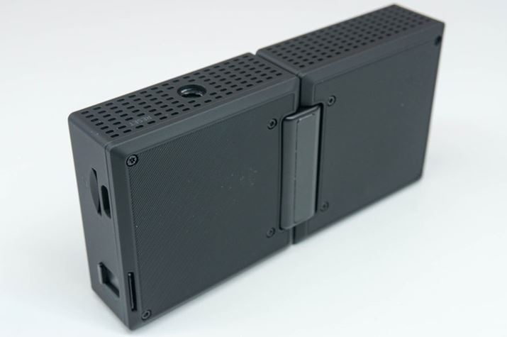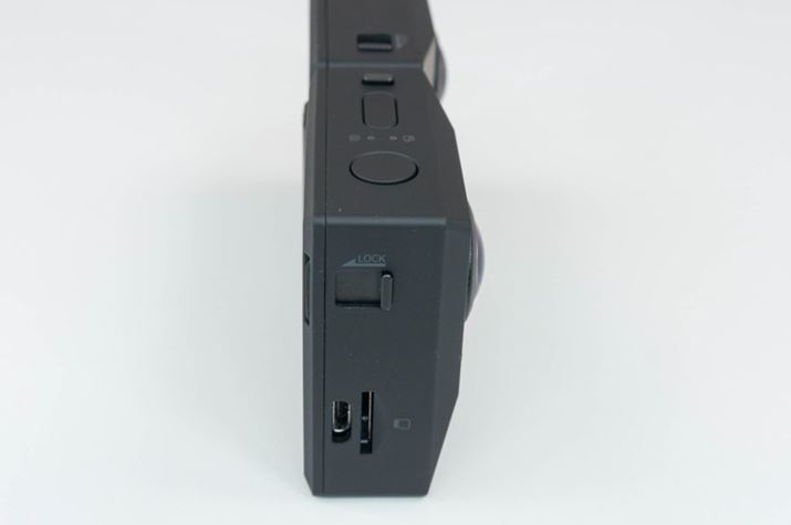 本体右側面には、折りたたみ時のロック用金具、micro USBポート、microSDカードスロット。上部には電源ボタンとシャッターボタン兼録画開始/停止ボタンがあります