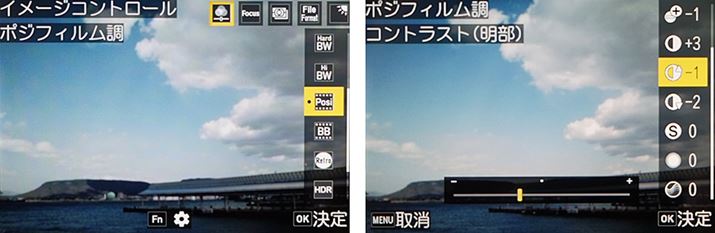 エフェクト機能を含めて仕上がり設定はイメージコントロールにまとめられた。スタンダード、ビビッド、モノトーン、ソフトモノトーン、ハードモノトーン、ハイコントラスト白黒、ポジフィルム調、ブリーチバイパス、レトロ、HDR調、カスタム2種といったモードが用意されている。調整できる項目は彩度、色相、キー、コントラスト、コントラスト(明部)、コントラスト(暗部)、シャープネス、シェーディング、明瞭度、調色、フィルター効果、粒状感、HDR調効果(※モードによって選択できる項目は異なる)