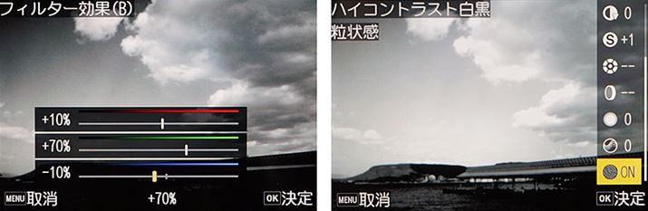 モノトーン系の設定が充実しているのも特徴。色調を選べるほか、ハードモノトーン以外のモードではRGBのフィルター効果を調整することも可能。さらにハードモノトーンでは粒状感を加えることもできる(※その他のモノトーン系設定でもファームウェアアップデートで対応する予定とのこと)