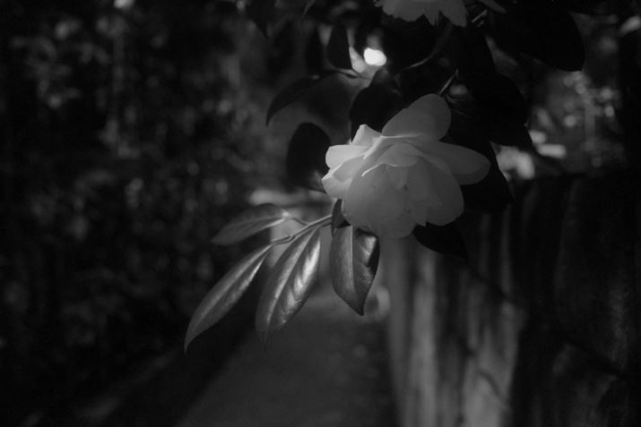 白い花にスポットライトがあたる状況をソフトモノトーンで撮ってみた。感度はISO3200なのでノイズは乗っているが、シャドーのトーンはしっかりと出ている。