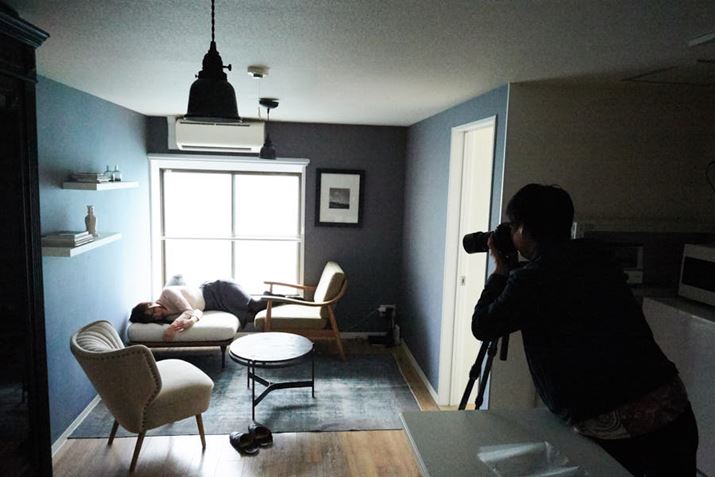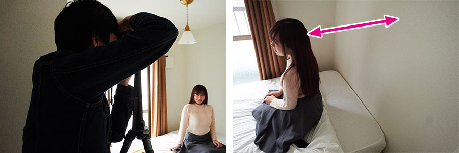 いっぽうの右。モデルが壁とベタづきだと「壁に影が落ちる」「背景に空気感が生まれない」など”奥行き感を損なう”結果になります。さらに悪いことに「クロス生地のテクスチャーまでピントが合ってしまう」という、生活感漂う残念な写真になってしまいます。