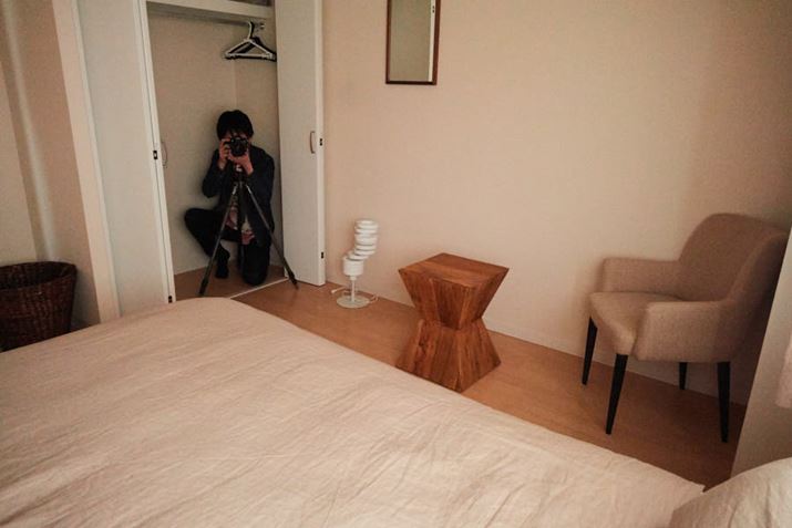 霧島さんのコスチュームチェンジの間に、次の撮影場所を探しました。クローゼットにカメラを設置できるこの部屋で「寝ポーズの全身写真」が撮れると考えました。(ひらめいたって感じ……)