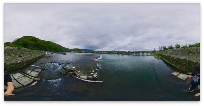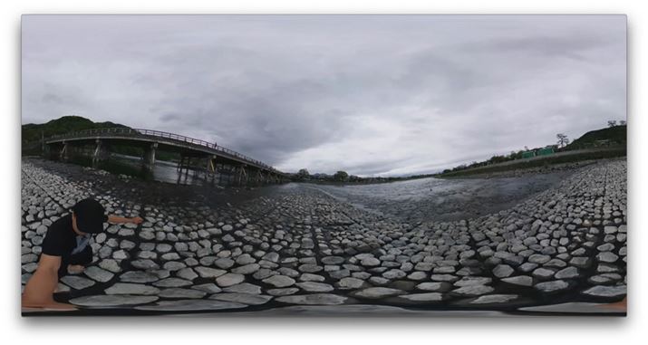 まずは、アウトドア(河原)での撮影。あいにくの曇り空ですが、空のハイライトが極端に白飛びすることなく、石と石の間などのシャドーもキレイに表現できています。橋の下のシャドーは黒つぶれしていますが、360°カメラで撮った動画としては十分なダイナミックレンジの広さです。