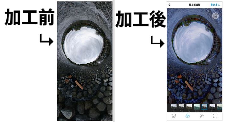 360°写真の編集は、撮影用のiPhone/Androidアプリ「THETA」とは別の、編集用アプリ「THETA +」で加工が可能。明るさやカラー、シャープネスといった基本的な補正からフィルター追加などができます。