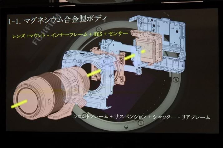 また、1億を超える高画素ということで振動対策もこれまでにないものになっている。大型のシャッターユニットは微細なショックを吸収できるようにユニットの天地・左右にサスペンションを搭載。加えて、マウント、手ぶれ補正ユニット、イメージセンサーという光学部分を一体化して吊るすような構造(インナーフレーム方式)にすることで、センサーとマウント面の平行平面性を確保しつつ、シャッター振動で発生するブレをできる限り抑えるように工夫されている。