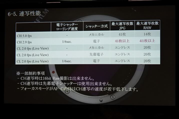 シャッター方式別の連写性能を示した資料。なお、ローリング速度は1/6秒なので、GFX100の電子シャッターは素早く動く被写体を撮るのに適していないとのこと