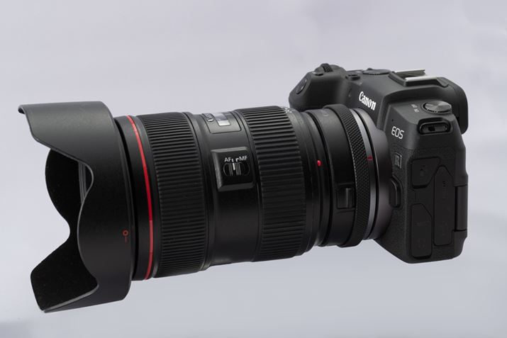 「コントロールリングマウントアダプターEF-EOS R」を介してデジタル一眼レフ用レンズ「EF24-70mm F2.8L USM II」を装着。コントロールリングがレンズ根元に位置してしまう