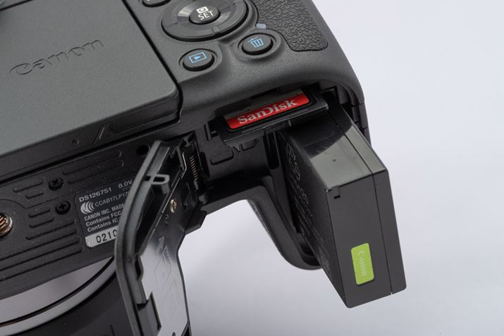 バッテリーはLP-E17。シングルードスロットで記録メディアはSD/SDHC/SDXCメモリーカード(UHS-II、UHS-Iカード対応)