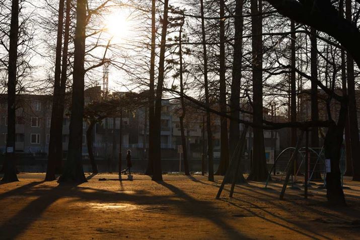 朝焼けの時刻に公園でのスナップ。暗めの露出でも、暗部の階調がとても豊かで影の部分のディテールがよく再現されている