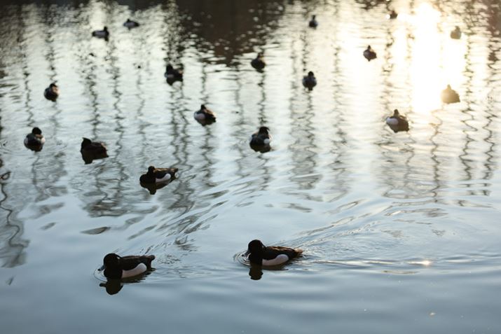 逆光状態で池の鴨を撮影。揺れる水面の質感描写に満足。絞り開放状態での撮影だが、AFは逆光状態でもスムーズに動作した