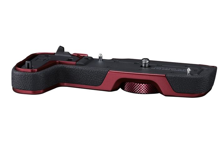 ボディ下部に装着する専用の「エクステンショングリップ EG-E1」。ブラック、レッド、ブルーの3色のカラーバリエーションを選べる(写真はレッド)。キヤノンオンラインストアでの価格は9,500円(税別、2019年6月11日時点)