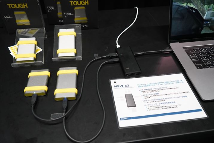 発表会の会場には、海外で発表されたUSB-Cハブ「MRW-S3」のデモ機も展示されていた。USB3.1 Gen2に準拠し、最速で実効1000MB/sのデータ転送速度に対応。100WのUSB PD給電にも対応している。HDMIやUSB-A、USB-C、USB-C(PD)のほか、UHS-II対応のSDXCスロットとmicroSDXCスロットも装備する