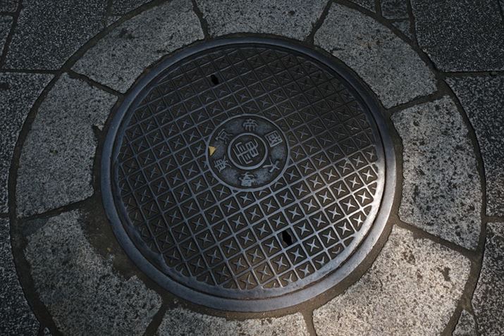 歴史を感じさせるマンホールの蓋。表面が摩擦で削られたせいかピカピカになり、光の当たった部分が輝いている。艶消しの部分と金属の質感の描き分けが見事だ