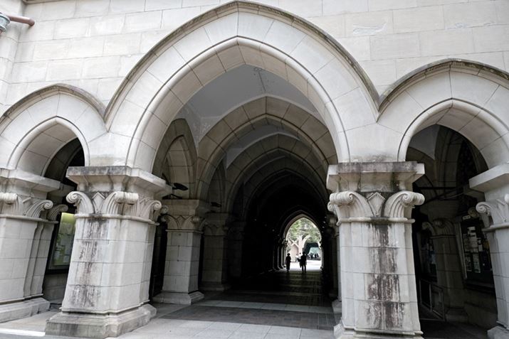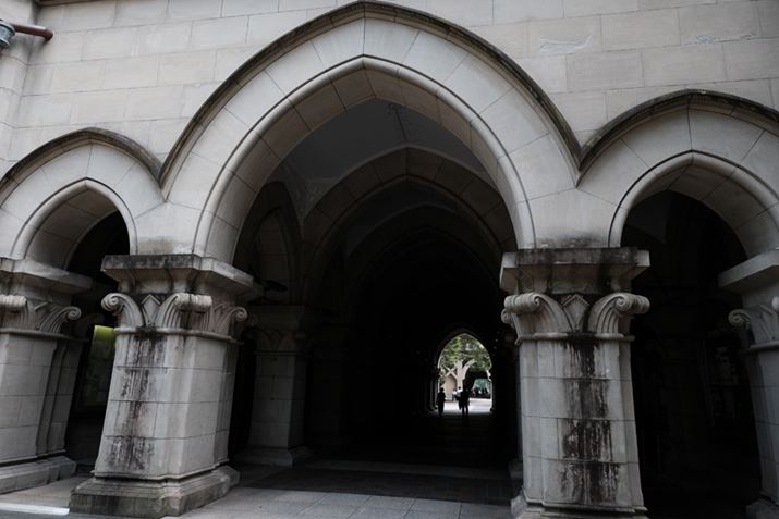 建物の間を行き来できるよう通路的に作られた1階部分。AEではかなり明るくなってしまうため、マニュアルモードに切り換えて撮影。肉眼で見たのに近い明るさになった