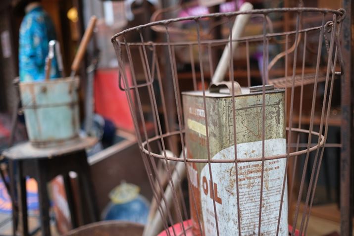 高円寺の商店街にあった店頭の飾り付け。絞り開放でボケを狙った。退色した金属缶と錆びたカゴの色合いと質感がいい