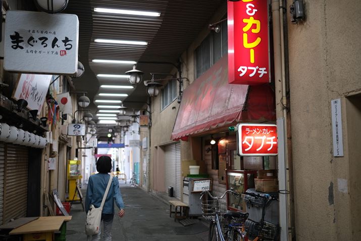 高架下の商店街。多くの飲食店が夕方から開店するため昼間の方がうす暗い。絞り開放でも周辺部までピントがシャープ。右下の自転車の金属の輝き、質感描写が見事だ