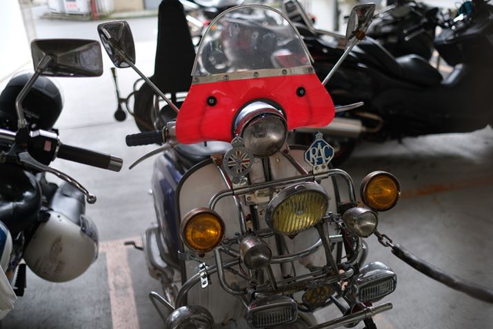 高円寺、駐輪場で見つけたVespa風のスクーター。1979年公開の映画「さらば青春の光」のカスタマイズ。光の当たらない高架下で鈍く輝いていた
