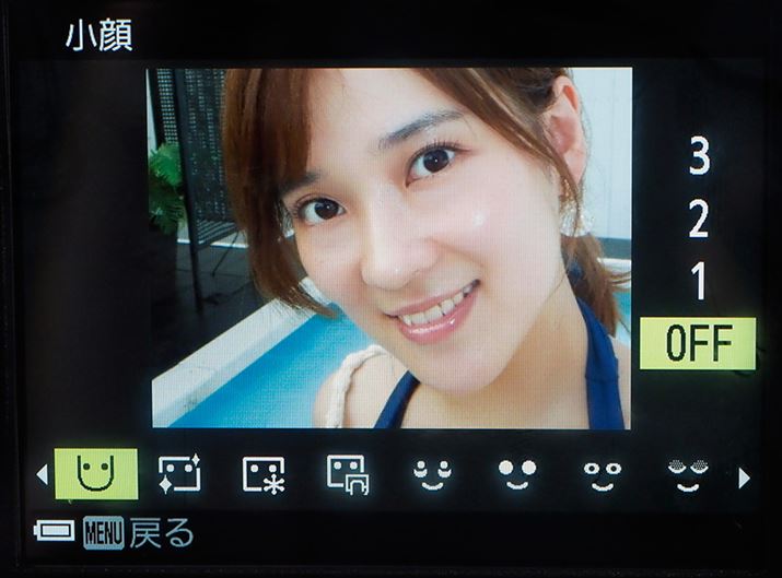 アイメイク(マスカラ)やクマ消し効果など、色々な“後からメイク機能”が選べますが、最初に小顔効果を使ってみることに。こちらがOFFの状態。
