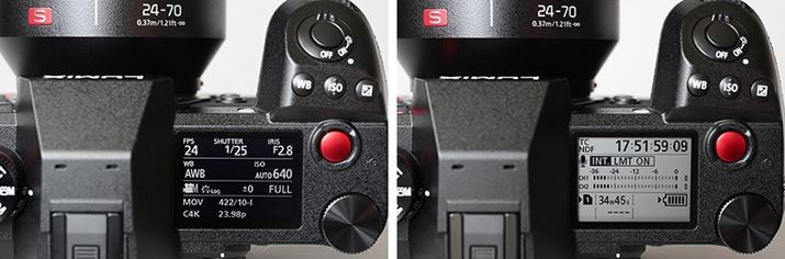 ボディ上面には、1.8型のモノクロステータスLCDを搭載。静止画用と動画用のステータス表示が可能で、動画用ステータス表示では、記録フレームレートやシャッタースピード、絞り値、ホワイトバランス、感度などの各種設定を確認できる表示と、タイムコードや録音レベル、動画記録時間などリアルタイムに変化するステータスを確認できる表示を切り替えて使用できる。液晶の色はブラックとホワイトの2色から選択することが可能だ。