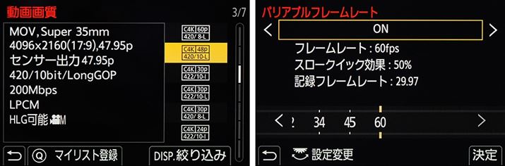 音声付きスローモーション動画の制作用としてCinema4K/48pなどの動画記録が可能(左)。VFR機能も利用できる(右)