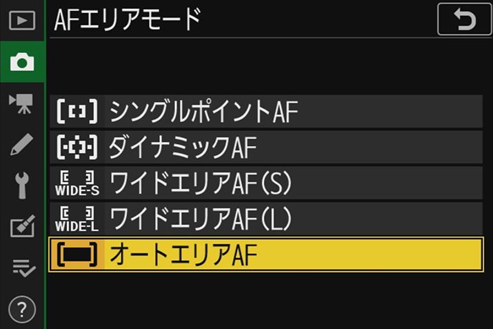 AFエリアモードはシングルポイントAF、ダイナミックAF、ワイドエリアAF(S)、ワイドエリアAF(L)、オートエリアAFの5種類