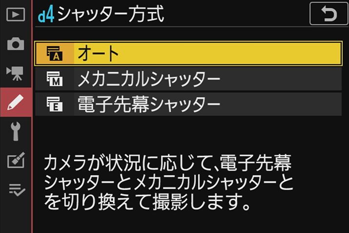 シャッター方式はオート、メカニカルシャッター、電子先幕シャッターの選択が可能。ただし、キットレンズとして用意される2本のズームレンズに関しては、設定によるのかもしれないが、試した限りはメカニカルシャッターを手動で選択できないようになっていた(※NIKKOR Z 35mm f/1.8 Sでは選択できた)。また、電子シャッター動作のサイレント撮影も搭載しており、サイレント撮影での連写も可能。対応するシャッタースピードはサイレント撮影も含めてすべてのシャッター方式で最速1/4000秒となっている。