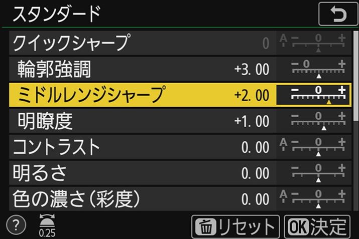 仕上がり設定「ピクチャーコントロール」の調整機能に、Z 7やZ 6と同様、細かい模様や線に対して効果のあるミドルレンジシャープが追加された