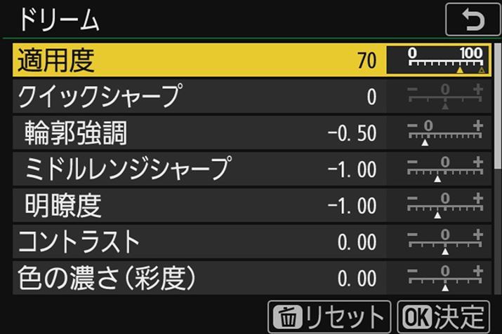 色合いや階調、彩度などを作り込んだ独創的な効果が得られる、計20種類の「クリエイティブピクチャーコントロール」も搭載。適用度を10段階から選べる