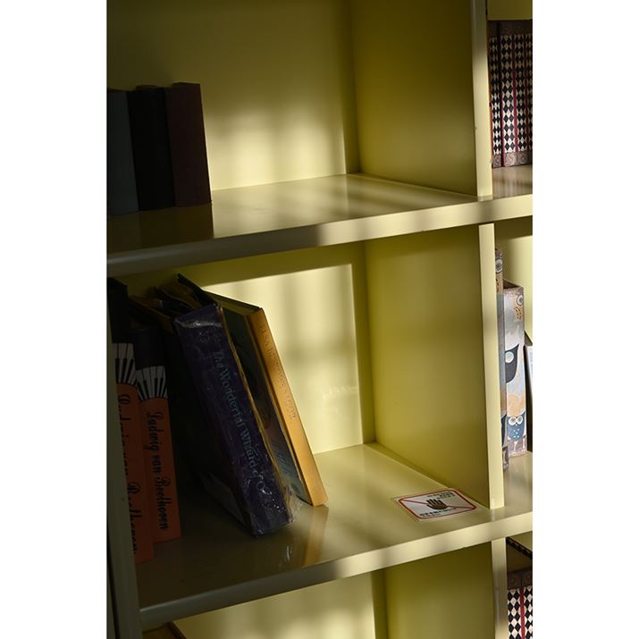 薄暗い屋内にて焦点距離50mmの開放F6.3で撮影。スポットライトが当たる本の背表紙にピントを合わせている。ピント位置では細かいところまで表現できている