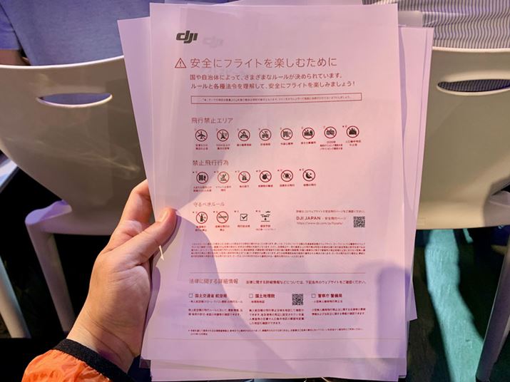 会場で配布された「安全にフライトを楽しむために」と書かれた資料には、航空法などの関連法規を守りドローンを飛行させるための情報がわかりやすくまとまっていました。DJIがドローンを安全に使ってもらうために、細かいところにも気を配っていることがうかがえます
