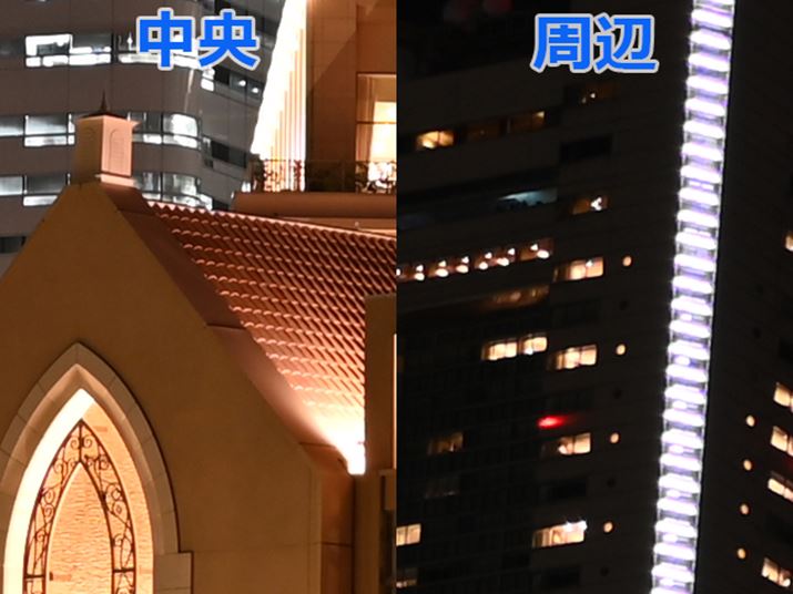 夜景を開放で撮影して点光源の再現性を確認してみたが、周辺だとわずかに色のずれやコマ収差が出ることもあるものの、広角24mmのレンズとしては全体的に収差がよく抑えられている。開放で撮ることが多い星景写真でも高画質な撮影を可能にするレンズだと思う。