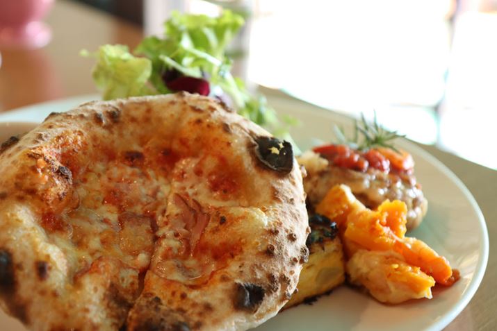 カフェ内でランチプレート。逆光状態で外は白飛びを起こす明るさだがハイライトにかけての描写も美しく、諧調やぶれなどの破綻もない