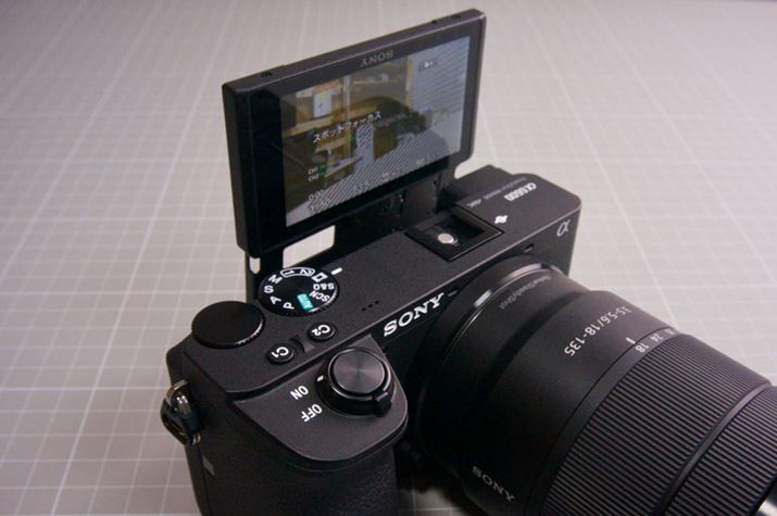上方に跳ね上げたモニターはレンズの真上に位置するため、自撮りの際に目線が左右にそれない点がメリット。いっぽうで、写真のように外付けのマイクを装着した際には干渉するのが弱点です