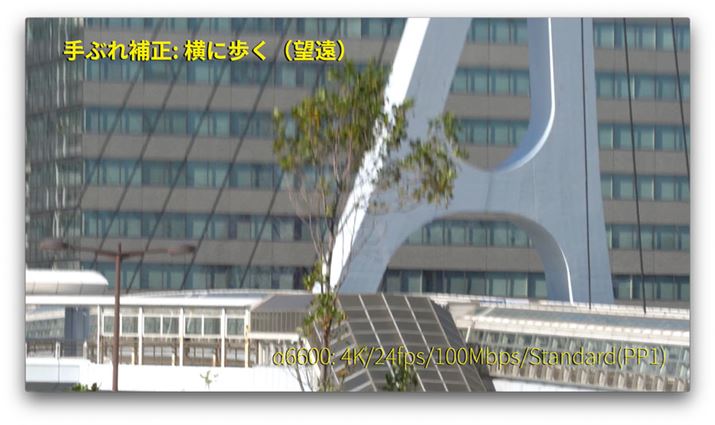 極端な例のため実際にこのようなシチュエーションで撮影をすることはないと思いますが、歩きながらの撮影で最大望遠にするとさすがにガクガクと揺れた映像になってしまいました