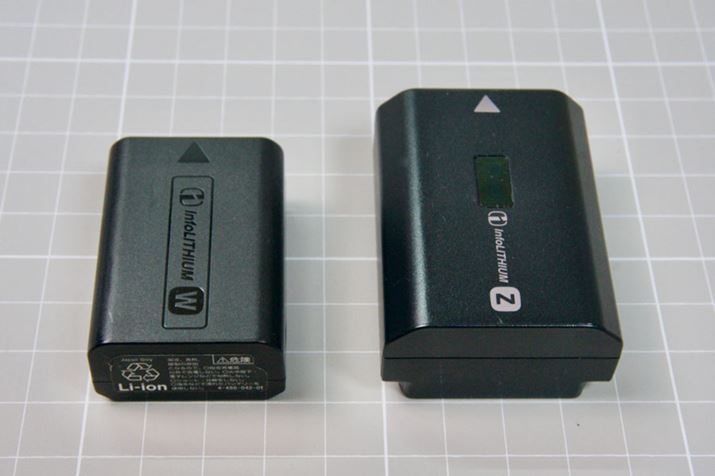 「α6500」のバッテリー(左)と比べるとふた回りくらい大きい「α6600」のバッテリー(右)。「α9」や「α7」シリーズと共有できるZシリーズとなっており、メーカー公称で最長約150分の動画撮影が可能です
