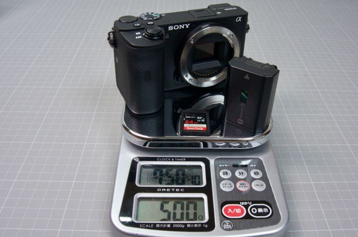 「α6600」のボディ重量は実測で約500g。「α6500」と比べると約90gの重量アップになっていますが、その分バッテリー容量が増えていることやグリップしやすくなっていることを考えると、サイズ増は納得できます