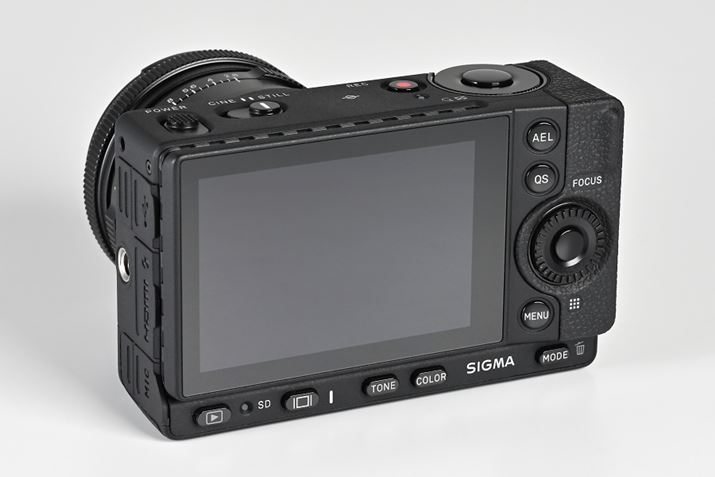 SIGMA fpの最大の特徴は、他メーカーのフルサイズミラーレスを圧倒する小型・軽量化を実現したことだろう。メカシャッターを廃して電子シャッターのみの構造とし、EVFも非搭載。さらに、ホットシューを外付けユニットにするなど徹底的にむだをそぎ落とすことで、112.6(幅)×69.9(高さ)×45.3(奥行)mmで重量422g(バッテリー、SDメモリーカードを含む)という、手のひらサイズの超コンパクトボディに仕上げている。出っ張りのないシンプルな箱型デザインもこのカメラならでは特徴だ。