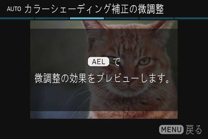 カラーシェーディング補正やトーンコントロール、カラーモードなどの画質補正・調整機能では、AELボタンを押すことでライブビュー映像が一時停止する仕様になっている。撮りたい絵を見ながらじっくりと追い込みたい際に便利