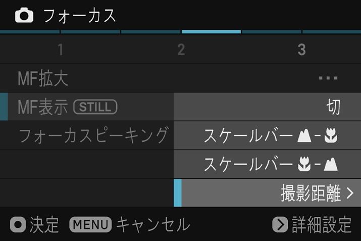 MF時の距離表示としてスケールバーと撮影距離の選択が可能。スケールバーは遠距離側と近距離側の表示を逆にすることもできる