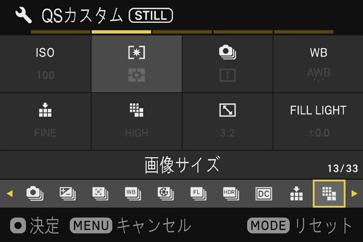 QSメニューに割り当てる項目を変更できるQSカスタムの設定画面。静止画撮影と動画撮影を別々に登録しておける
