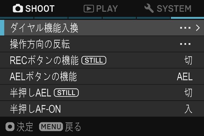 前後ダイヤルの機能の入れ替えや、操作方向の反転のほか、RECボタンやAELボタンの機能、シャッターボタン半押し時のAF-ON/AELの有無などの設定が可能