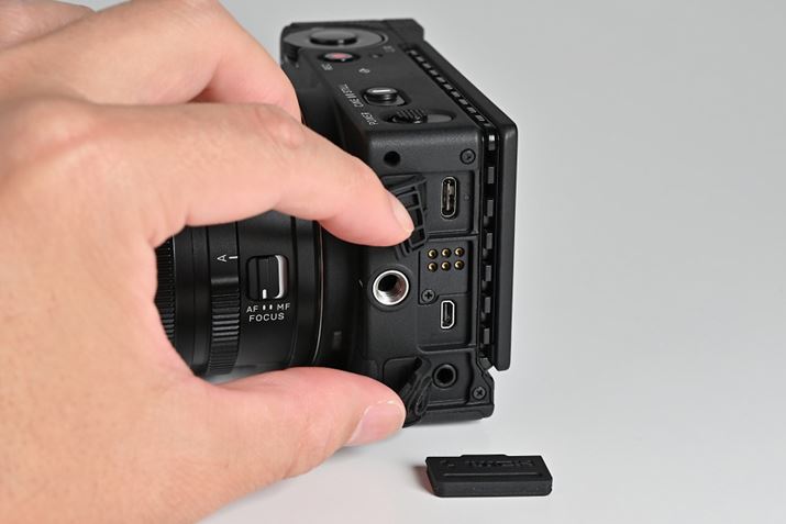 小型・軽量で持ち運びやすいということに加えて、拡張性を考慮したデザインになっているのも面白い。シンプルな箱型デザインのボディは使い方に合わせてさまざまなスタイルに対応可能。USB Type-C(USB 3.1 Gen1)、HDMI(Type D Ver.1.4)、プラグインパワー対応のステレオマイク端子といったひととおりのインターフェイスを備えており、本格的なシネマカメラシステムへの導入や、ドローンに搭載しての空撮、ジンバルを使った手持ち撮影など、特にムービー用として多彩なスタイルで使用できるようになっている。