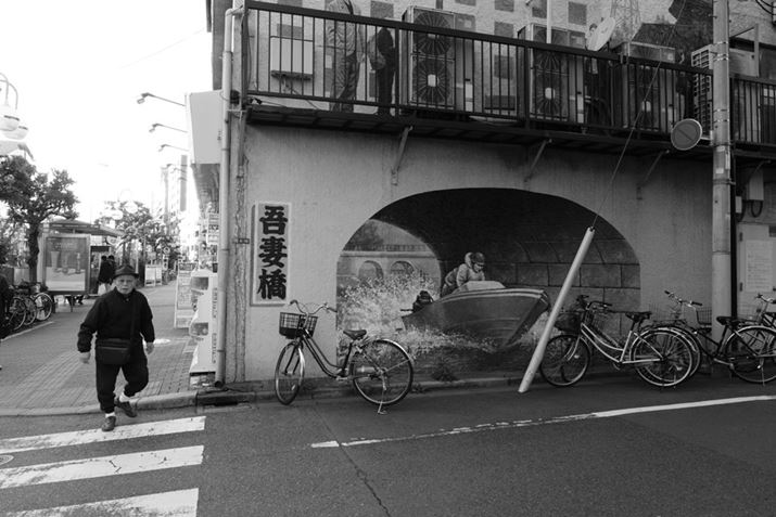 壁面に描かれたトリックアートはモノクロの方が本物らしく見えた