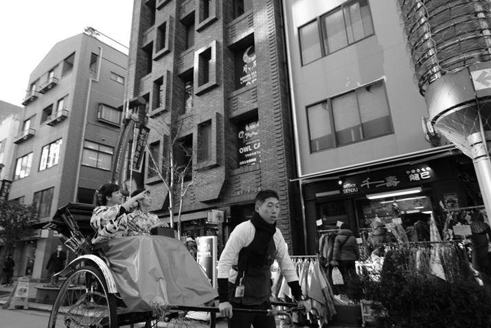 年の瀬と言うより正月らしい風景。走り去る人力車をノーファインダーで撮った
