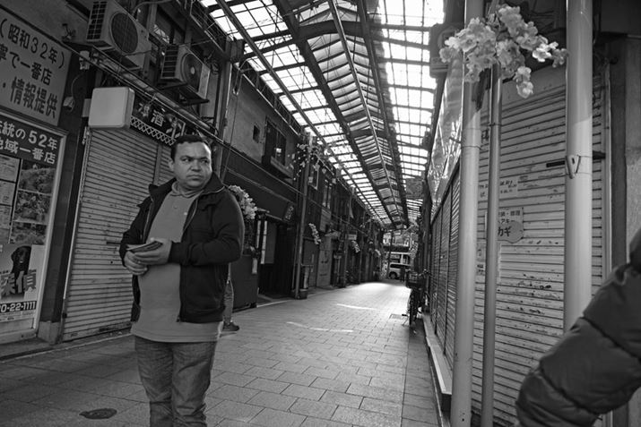 妙に明るいシャッター商店街でビラを配る男。硬すぎないレンズの描写がいい